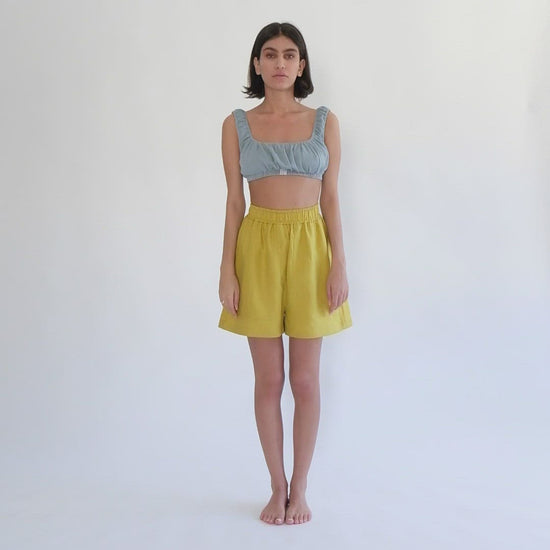 Made from up-cycled linen, the Boxer shorts are high waisted with a thick elastic waistband, faux fly and side pockets.