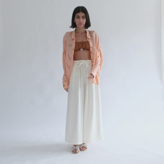 Made from Oeko-Tex certified surplus V-Label Vegan silk, this oversized boxy blouse features a Bauhaus inspired print in contrast ruby on a blush coloured. Contrast cinnamon coloured buttons.
